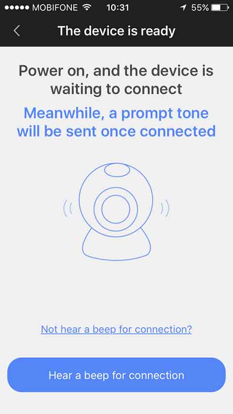 Nhấn lần lượt “Nghe thấy âm thanh nhắc nhớ kết nối” và “Tiếp tục” để điện thoại quét và kết nối camera